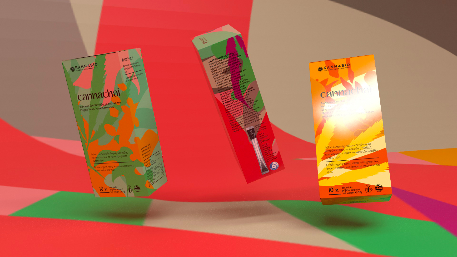Branding and packaging design for Cannachai herbal tea series. A celebration of taste and colour for this fusion herbal tea and cannabis.